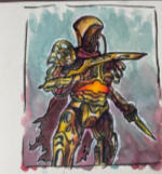 This character is created by the player who is interested in puzzles in rpgs but haven’t quite gotten into the hobby as much as the rest of us. The idea for his character was first just a throwaway joke that he wanted to play “HK-47” known from the “knights of the old republic”- game, but that idea was further developed into an actual concept. This character is a former part of the staff in Chromeria, but his control disc has ben altered by the attack and now he expressess free will. The drawing below is made by this player.